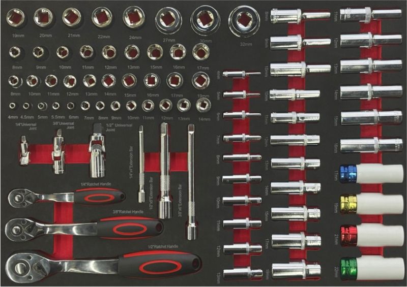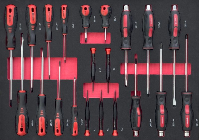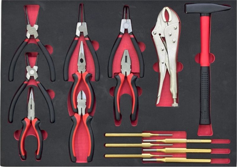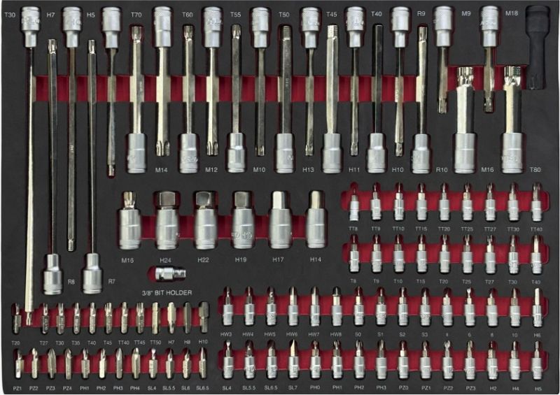 - 6 чекмеджета с висококачествени ръчни инструменти, организирани върху EVA tray подложки, и едно чекмедже с по-голям обем за допълнителни машини и части.