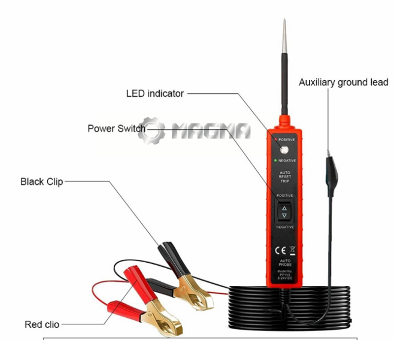 Този многофункционален тестер за автомобилни вериги е основен инструмент за диагностика на електрическите системи на автомобили, камиони, лодки, мотоциклети и ремаркета с напрежение от 6V до 24V DC. Снабден е с ярък LED индикатор за показване на полярността (червен за положителна, зелен за отрицателна) и звуков сигнал. Инструментът разполага с чувствителна защита от късо съединение (предпазител) за безопасна употреба около чувствителната електроника на превозното средство и удължен кабел (обикновено около 4 метра) за достигане до всички краища на автомобила от едно свързване към батерията.
